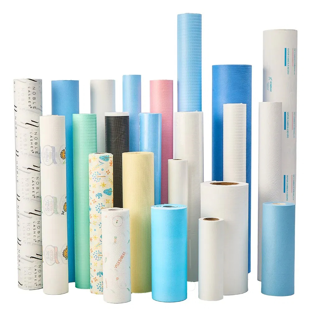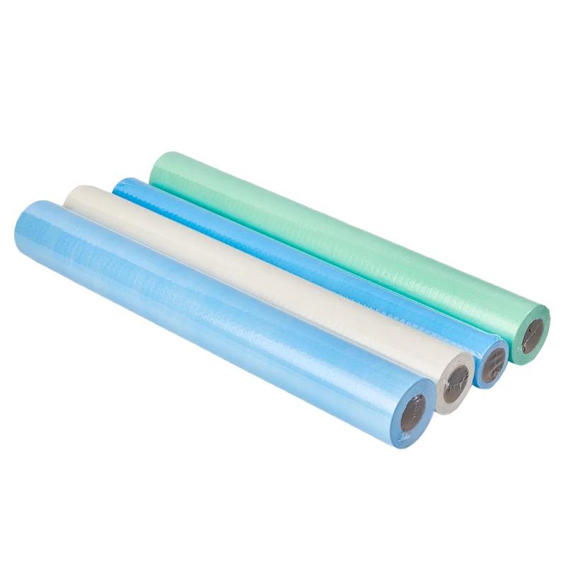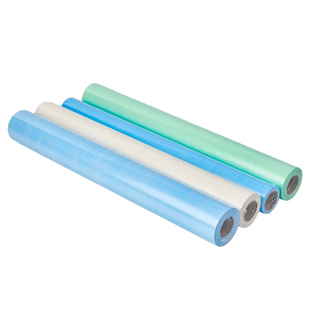 Material: papel + película de PE: garantiza que el rollo de sábanas médicas revestidas de PE sea impermeable y resistente al aceite.
