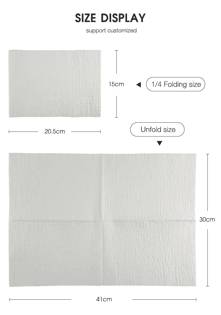 A: El tamaño es de 30 cm × 40 cm, estructura de 3 capas con 55 g por unidad, ideal para uso diario desechable.