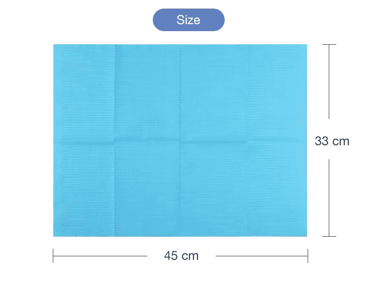 A: El tamaño es de 45×66 cm, lo suficientemente grande como para proporcionar una amplia cobertura tanto para pacientes adultos como infantiles durante el tratamiento dental, protegiendo su ropa y el área circundante.